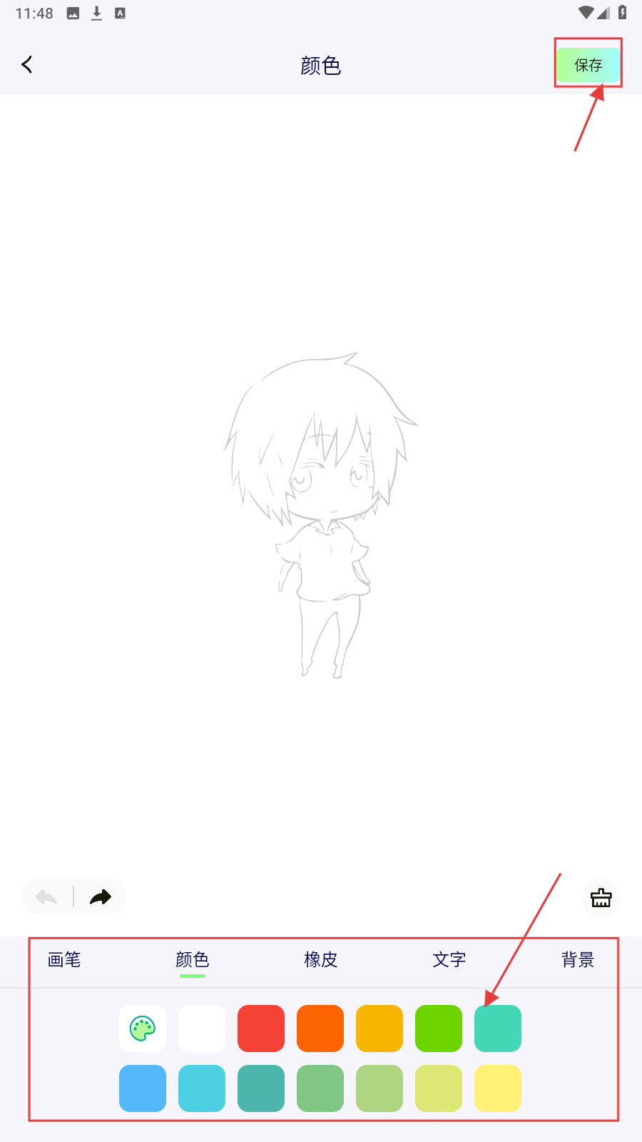 4、选择线稿模板后,进入上色页面,从下方选择颜色为线稿上色,完成后点击右上角【保存】。