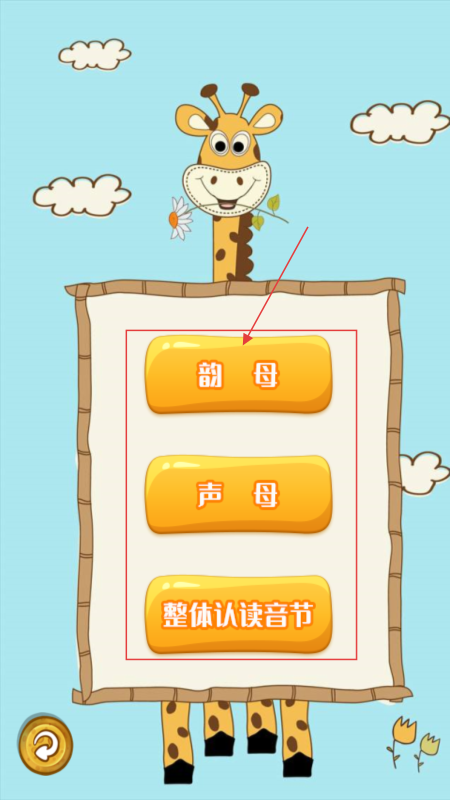1、打开应用后,可根据学习需求,选择【韵母】【声母】或【整体认读音节】模块开始学习。