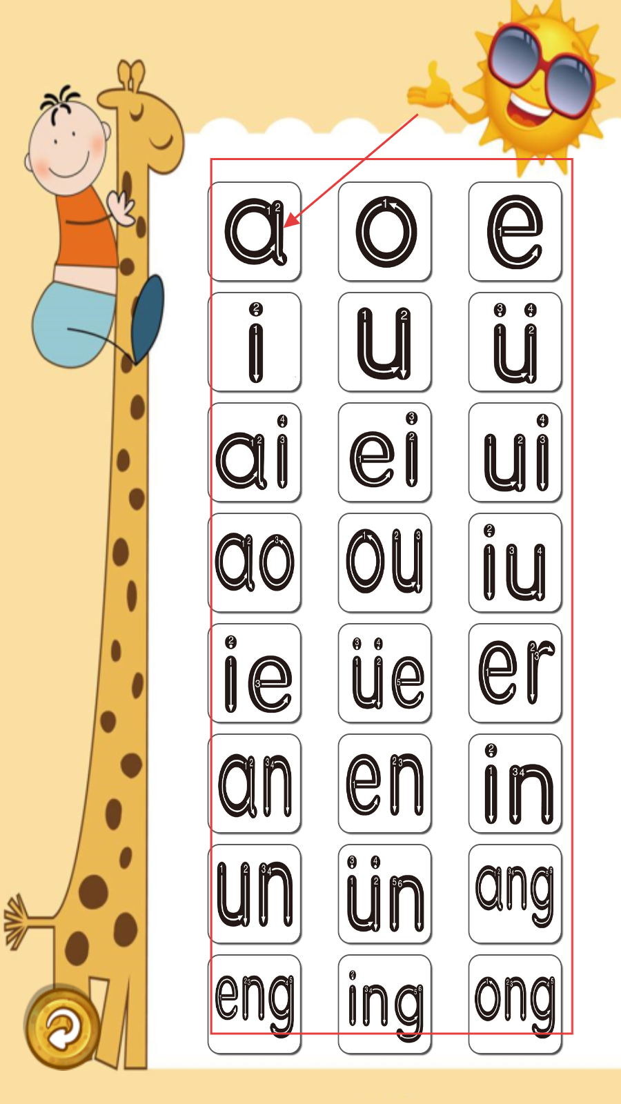 2、以【韵母】模块为例,点击进入后,可看到包含【a】【o】【e】等在内的韵母列表,点击可查看详情。