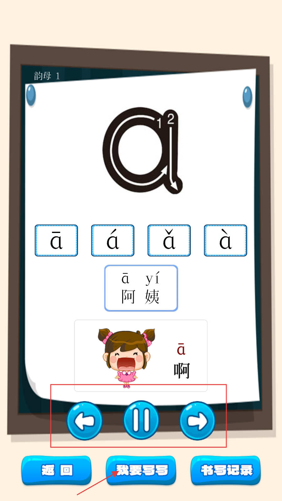 3、点击具体韵母,如【a】后,可查看其发音、声调及例词,还能通过下方按钮切换学习内容。