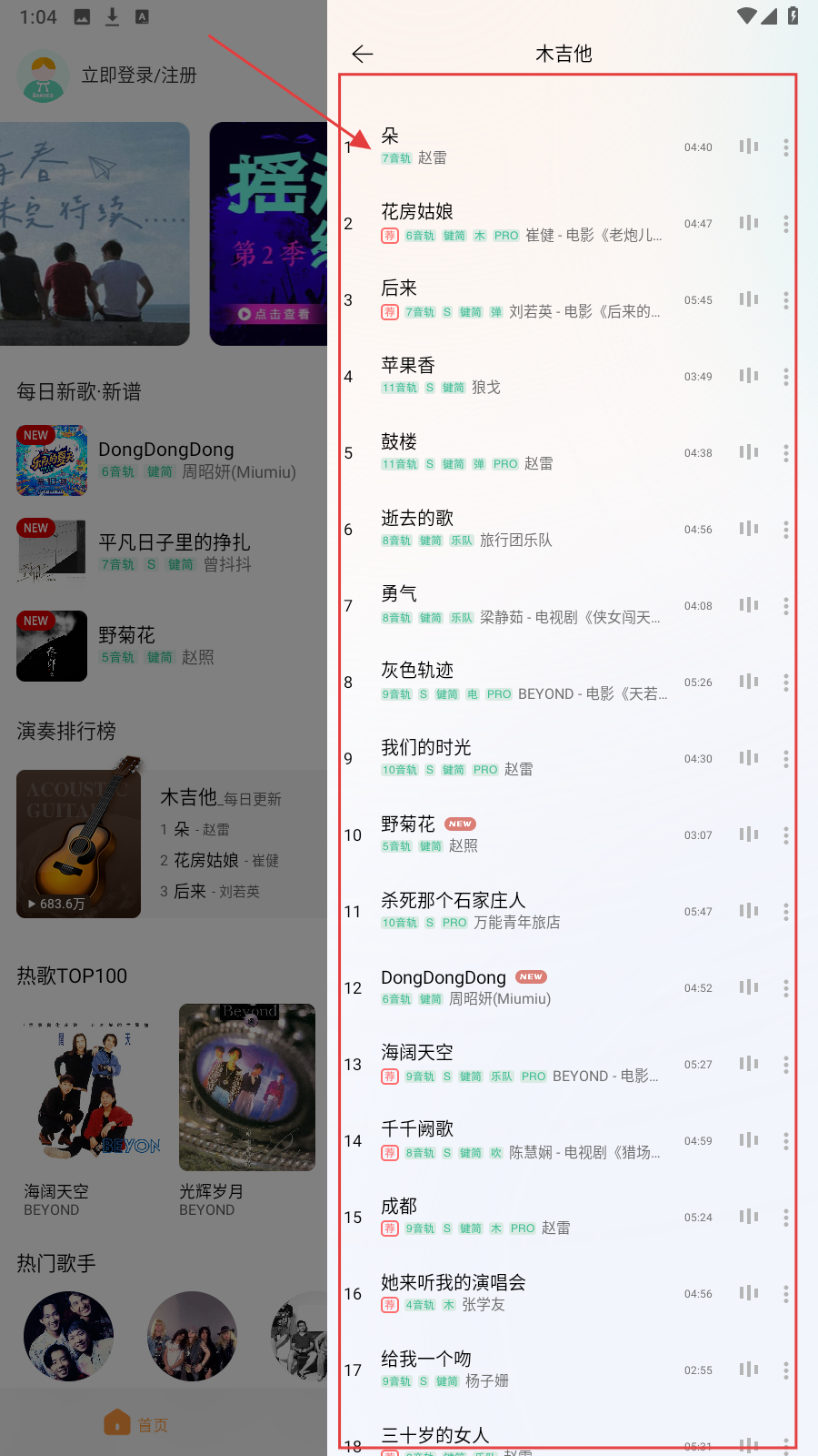 2、若对【木吉他】演奏榜感兴趣,点击进入后,可查看包含【朵】等歌曲的列表,点击可播放。