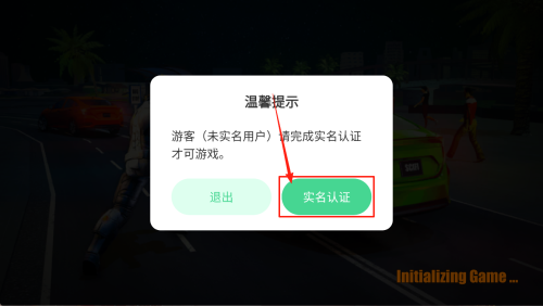 1、看到“温馨提示:游客(未实名用户)请完成实名认证才可游戏”后,点击“实名认证”按钮。