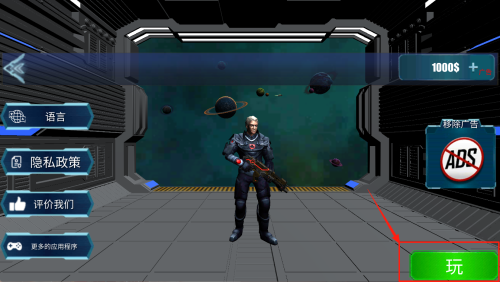 4、进入“1000S 语言 移除广告 岛隐私政策 ADS 评价我们 更多的皮用程序 玩”主菜单,点击“玩”即可正式开始游戏。