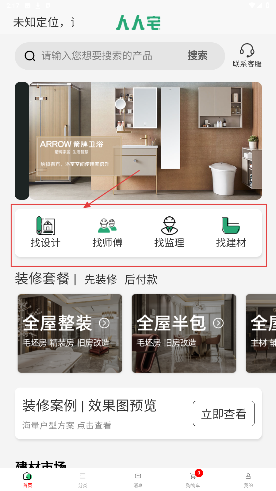 1、进入【人人宅】首页,可搜索产品,也可通过找设计、找师傅等功能入口,开启装修相关服务选择。