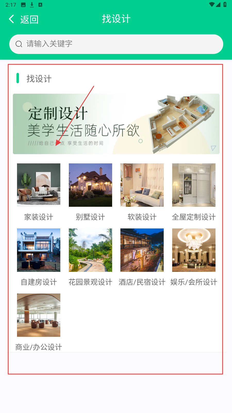 2、点击【找设计】,从家装设计、别墅设计等分类中,挑选符合需求的设计服务类型。