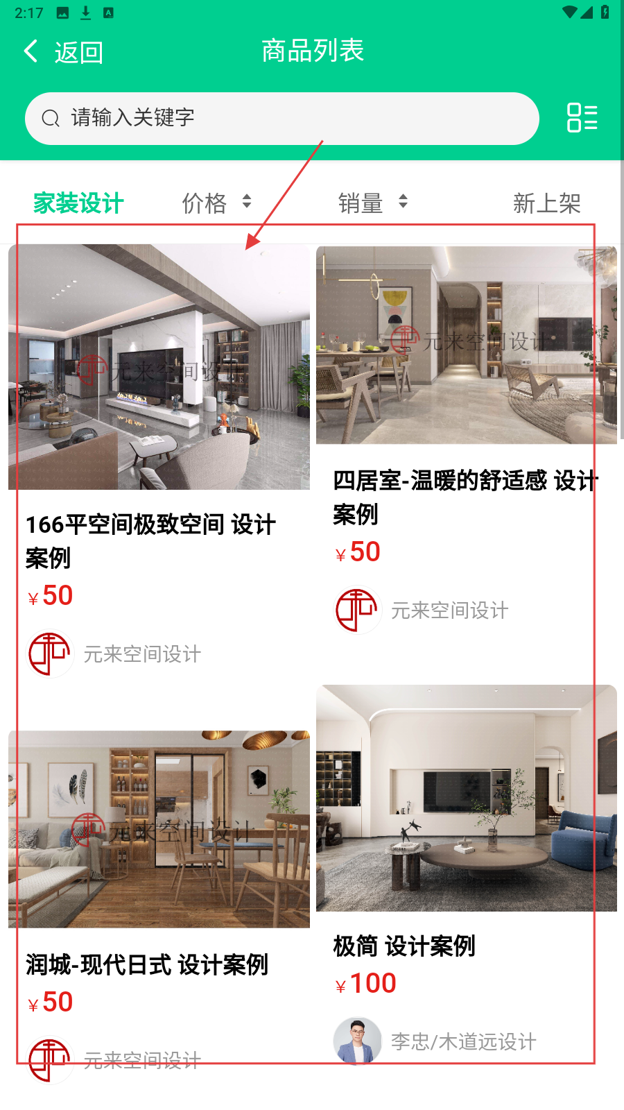 3、在商品列表页面,可按价格、销量、新上架对家装设计案例排序,浏览并选择心仪案例。