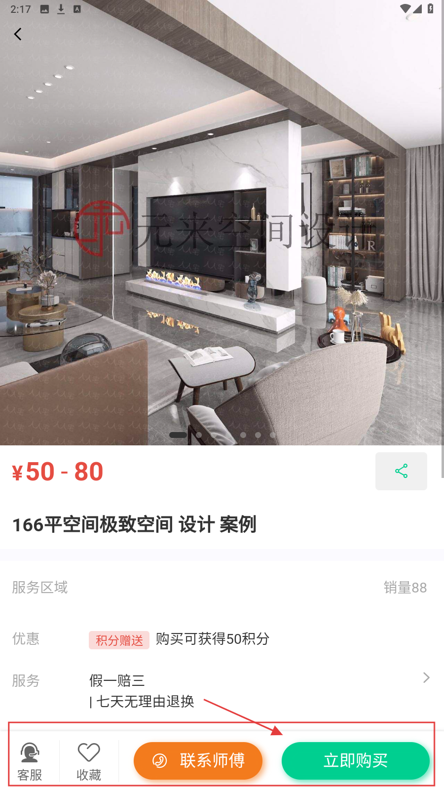 4、进入设计案例详情页,查看案例信息后,可点击【联系师傅】咨询或【立即购买】服务。