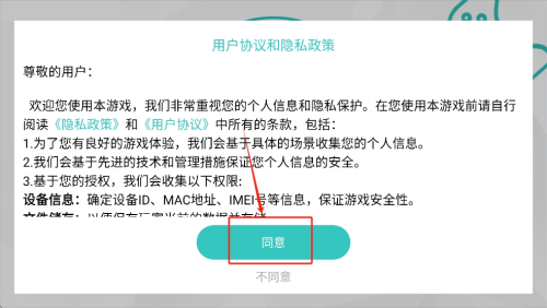 1、阅读并同意用户协议和隐私政策,点击“同意”按钮以接受条款并开始游戏。