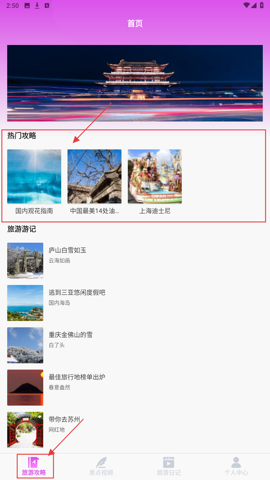 1、进入APP首页,可查看热门攻略和旅游游记板块,获取旅游相关信息。