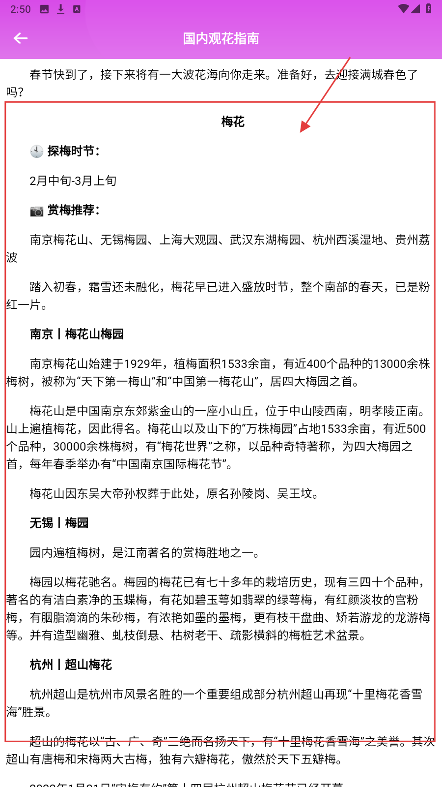 2、点击【国内观花指南】,了解梅花的探梅时节和赏梅推荐地点。