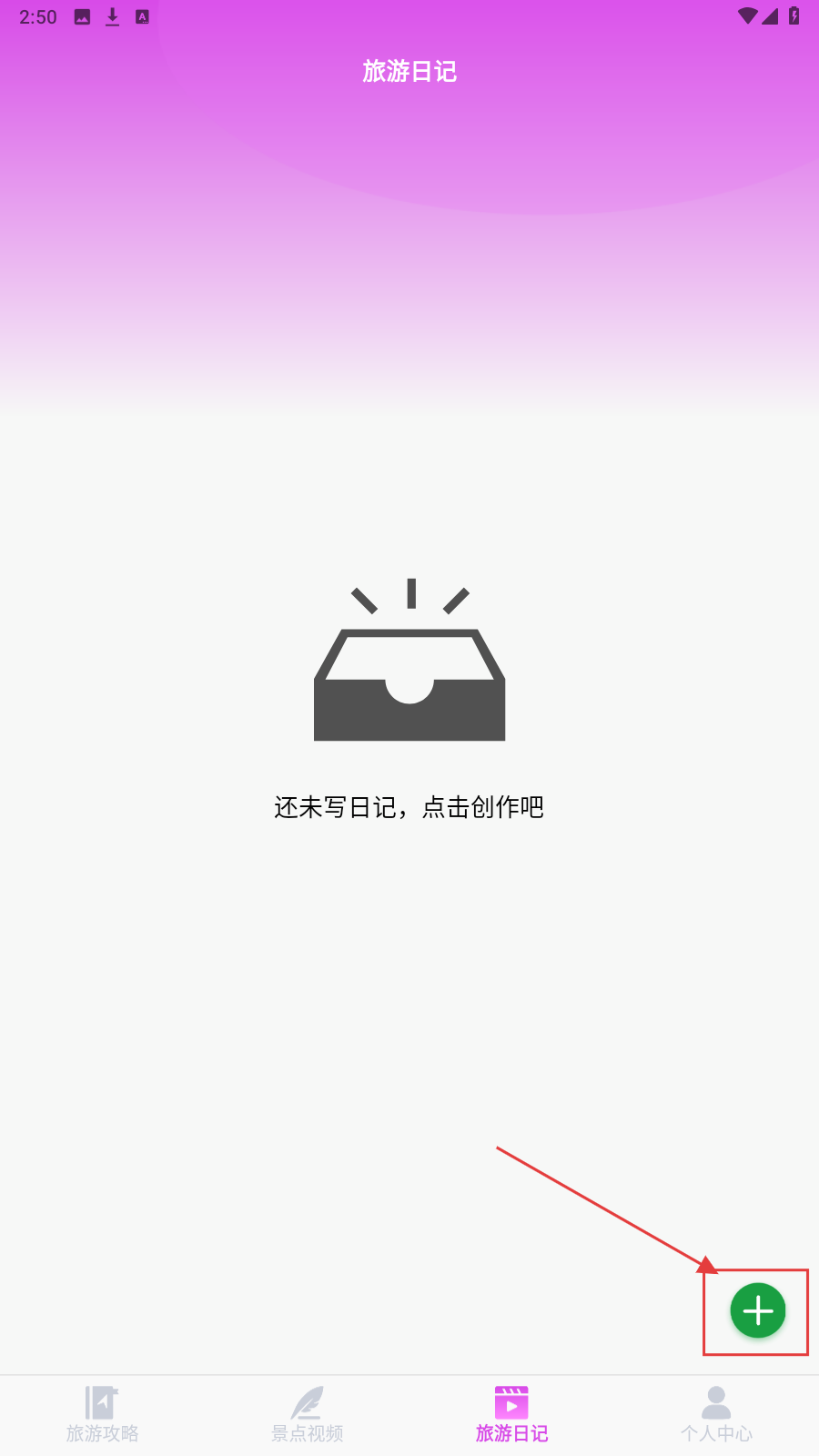 3、进入【旅游日记】页面,点击绿色“+”按钮,开始创作旅游日记。