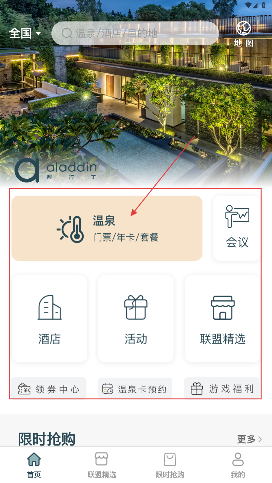 1、打开【阿拉丁温泉】APP,在首页可搜索温泉、酒店等,也可点击温泉、会议等服务入口获取对应服务。