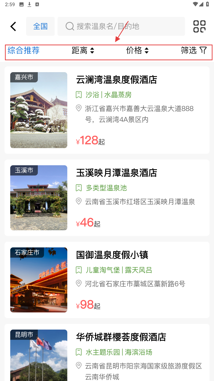 2、在温泉搜索结果页面,可按综合推荐、距离、价格排序或筛选,挑选心仪的温泉酒店。