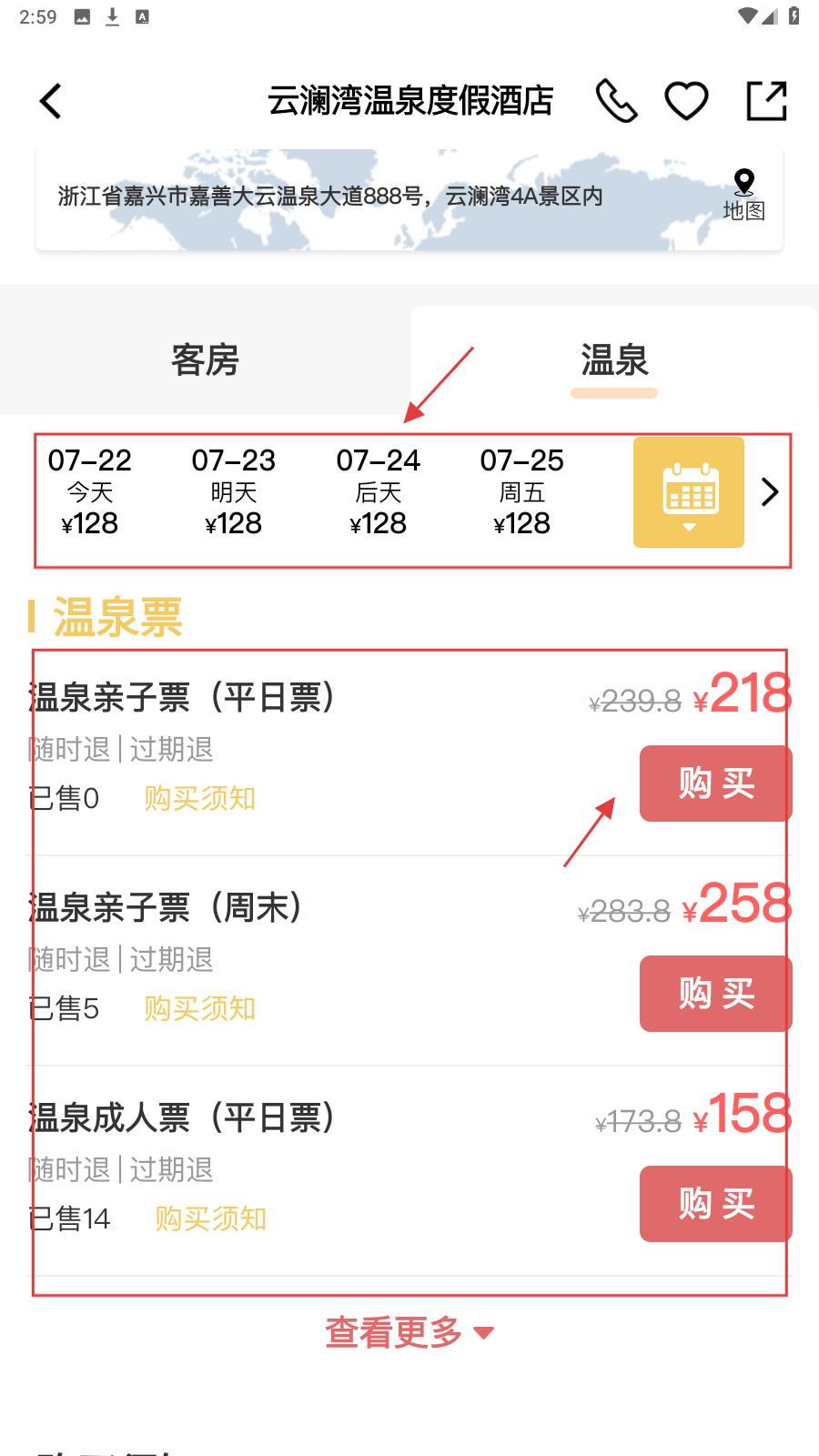 3、进入云澜湾温泉度假酒店详情页,选择温泉服务,查看不同日期价格和门票类型,点击【购买】按钮购票。