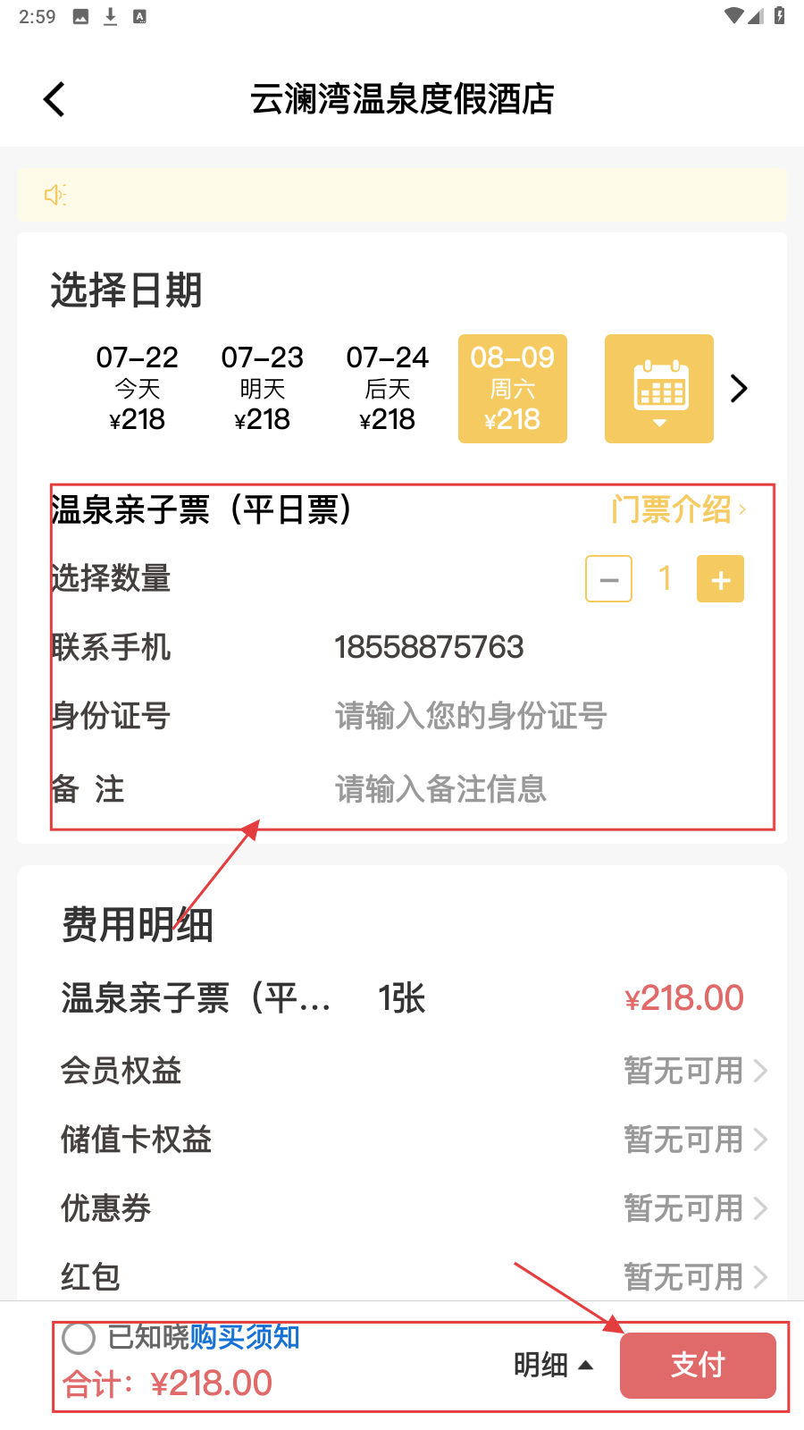 4、在购票页面选择日期,填写购票信息,确认费用明细后,勾选已知晓购买须知,点击【支付】完成购票。