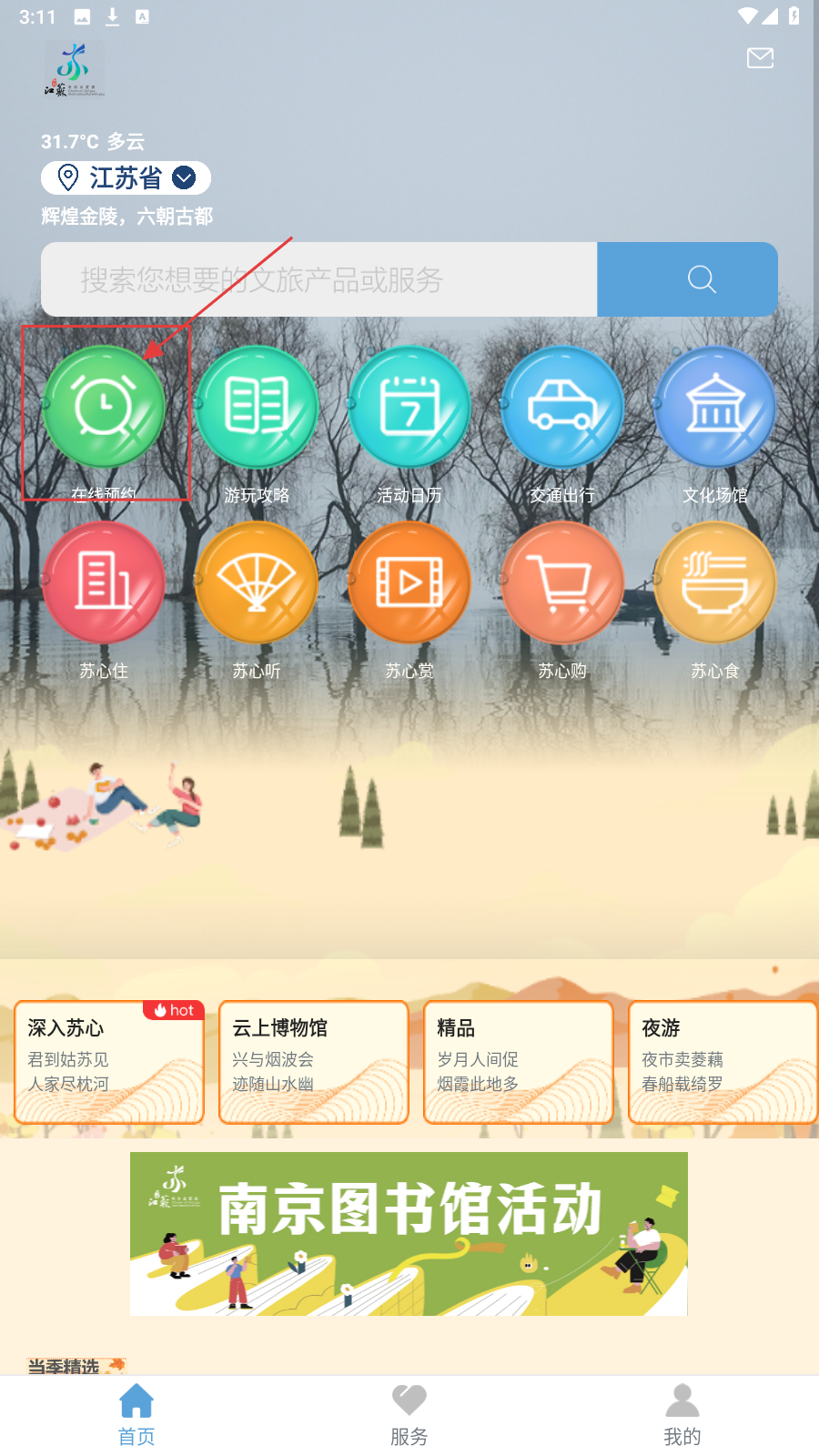 1、打开苏心游APP,在首页可搜索文旅产品,也可点击【在线预约】、【游玩攻略】等功能入口获取对应服务。