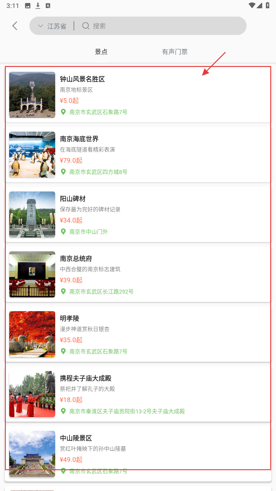 2、在景点列表页面,浏览【钟山风景名胜区】、【南京海底世界】等景点信息,选择感兴趣的景点。