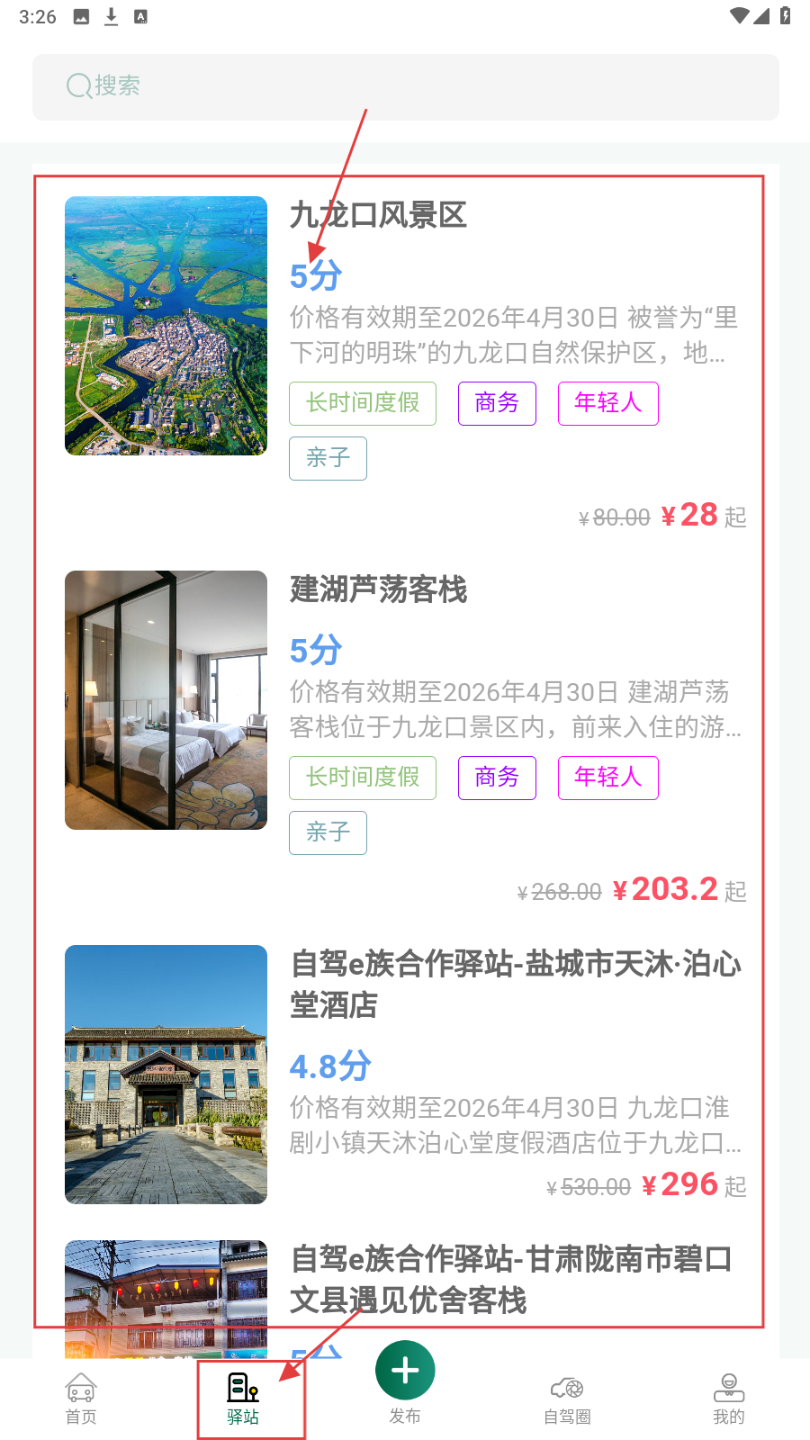 1、进入自驾e族APP的【驿站】页面,浏览九龙口风景区、建湖芦荡客栈等景点和酒店信息,选择感兴趣的项目。