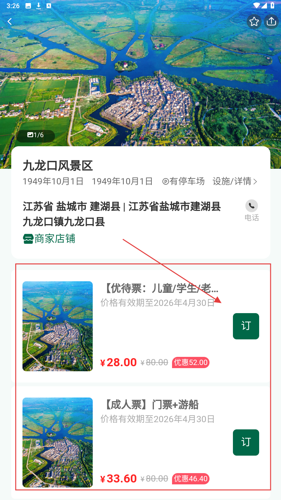 2、进入九龙口风景区详情页,查看【优待票:儿童/学生/老人】门票+游船等门票信息,选择合适的门票类型。