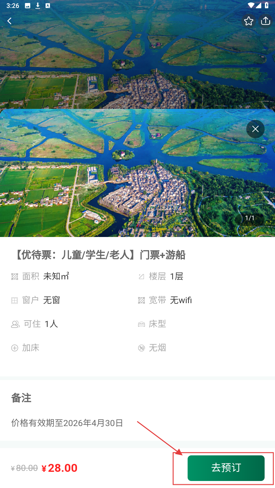 3、在九龙口风景区门票+游船预订页面,确认预订信息后,点击【去预订】按钮完成预订。