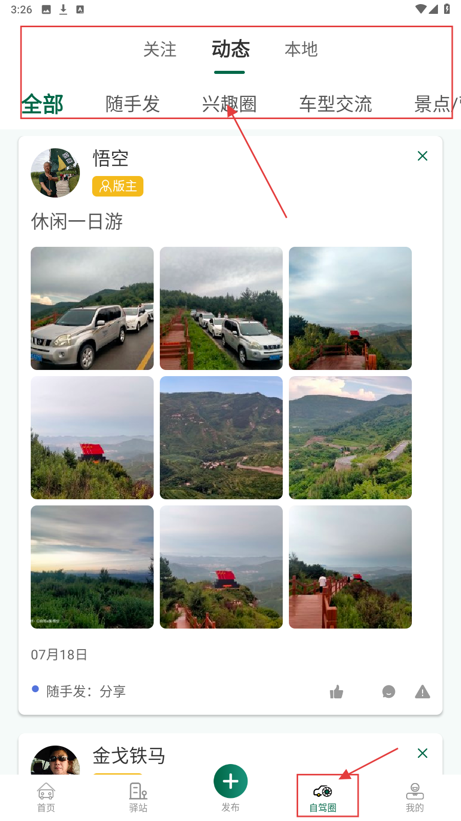 4、进入【自驾圈】页面,浏览用户发布的动态,如“悟空”的“休闲一日游”,获取旅游灵感。