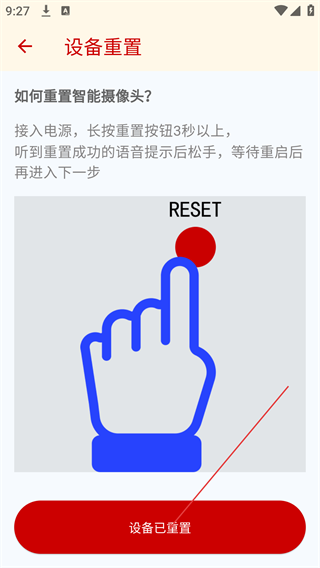 3、按照页面提示完成设备重置:接入电源后长按重置按钮3秒以上,听到语音提示后松手,等待设备重启,点击【设备已重置】按钮。