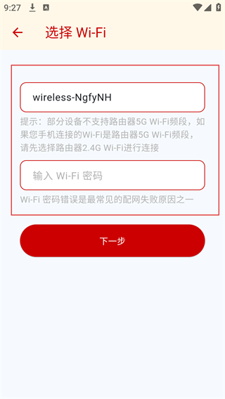 4、进入选择WiFi页面,选择目标WiFi并输入密码,点击【下一步】完成设备配网与添加。