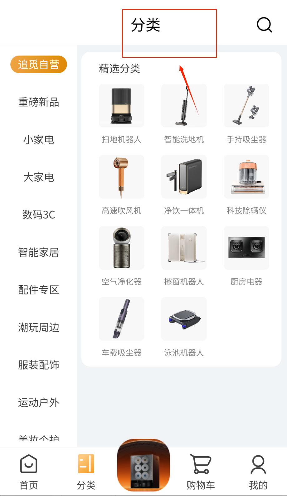 2、成功登录后进入软件首页界面,在底部导航栏找到"分类"功能模块,点击进入商品分类页面。该区域按照商品属性进行详细划分。