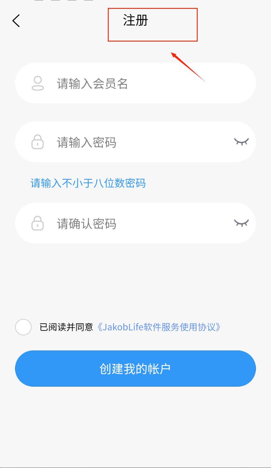 2、依次在输入框中填写会员名和密码,注意密码需8位以上且两次输入一致,勾选协议条款哦。