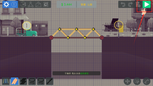 3、然后,测试桥梁的稳定性。点击播放按钮测试桥梁是否能够承受车辆的重量,通过调整优化桥梁结构。