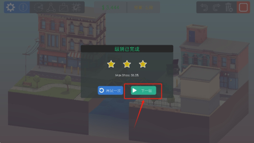 4、最后,完成关卡并进入下一关。当桥梁成功承载车辆后,点击“下一关”按钮继续挑战新的关卡。