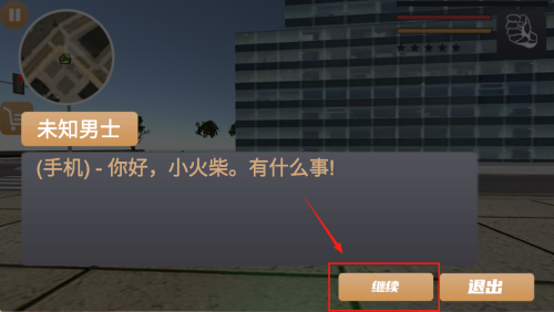 2、若弹出对话“未知男士(手机)-你好,小火柴。有什么事!”,点击“继续”观看剧情,或点“退出”跳过。