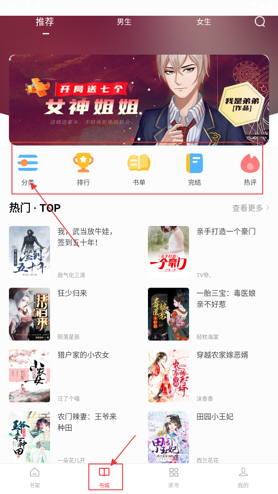 1、进入应用,在【书城】页面点击上方【分类】按钮。