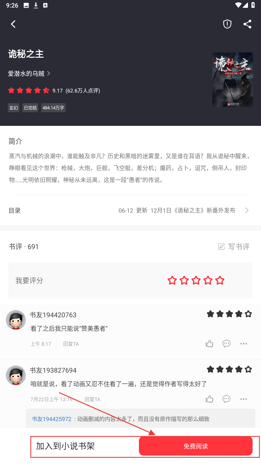 4、进入小说详情页,点击右下角【免费阅读】即可进行阅读,一起阅读起来吧。