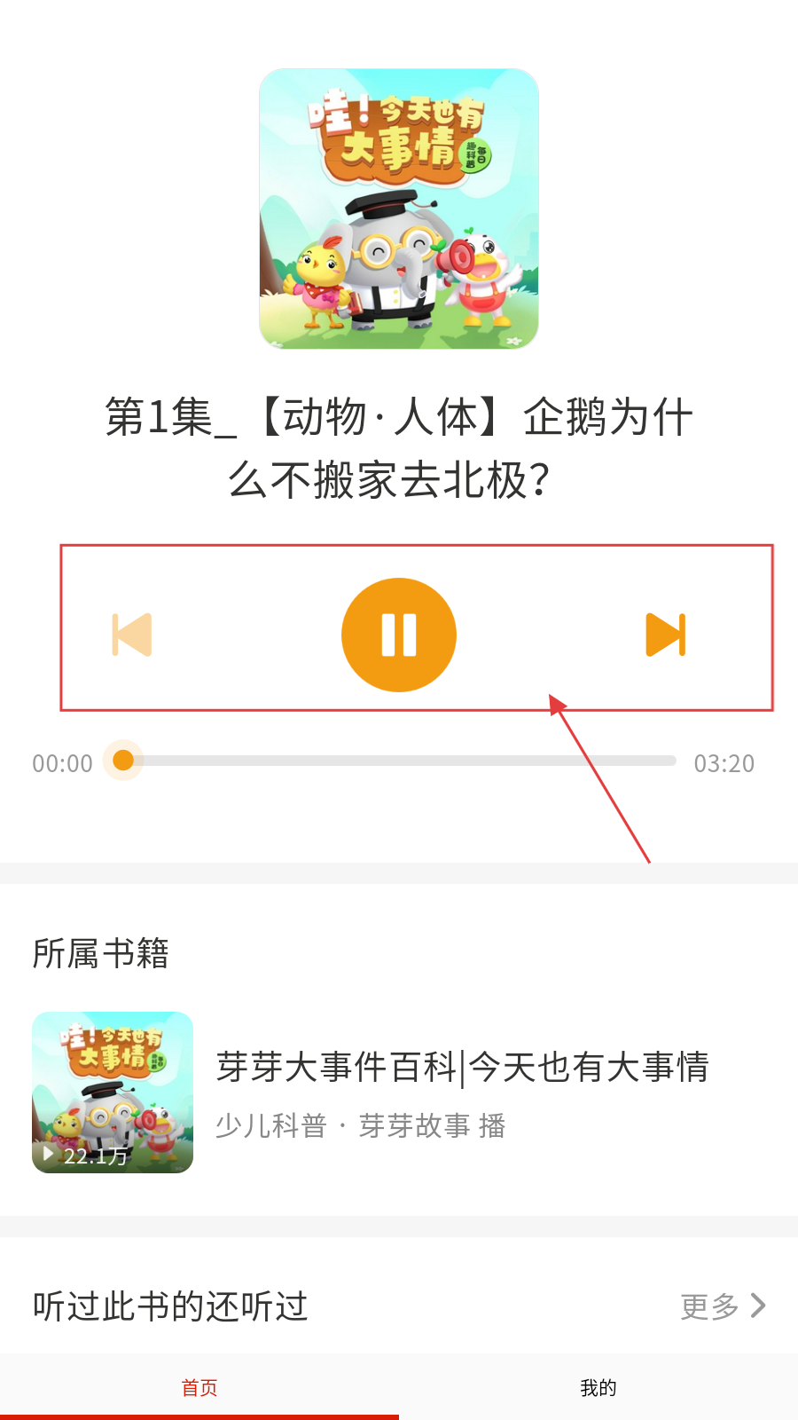 4、进入书籍播放页面,可以进行播放、暂停、切换等操作,快和小朋友一起收听故事吧。