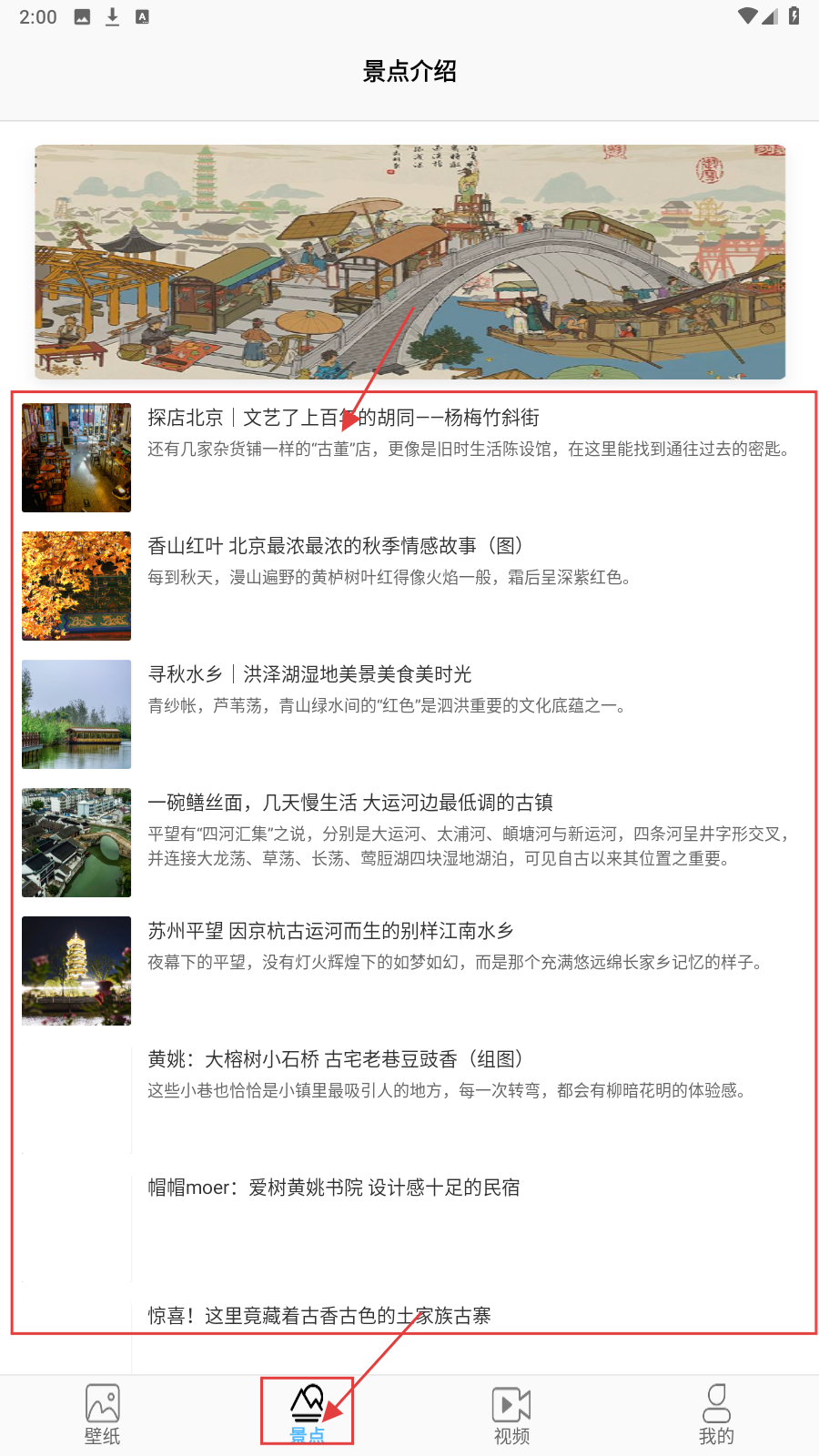 1、进入【景点】页,浏览各景点介绍,选感兴趣的如【杨梅竹斜街】了解详情。