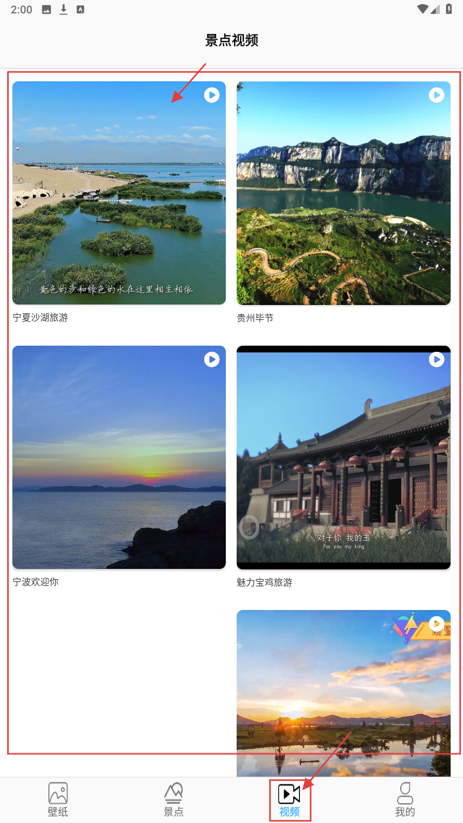 3、切换到【视频】页,选心仪景点视频如【宁夏沙湖旅游】,点击播放赏景。