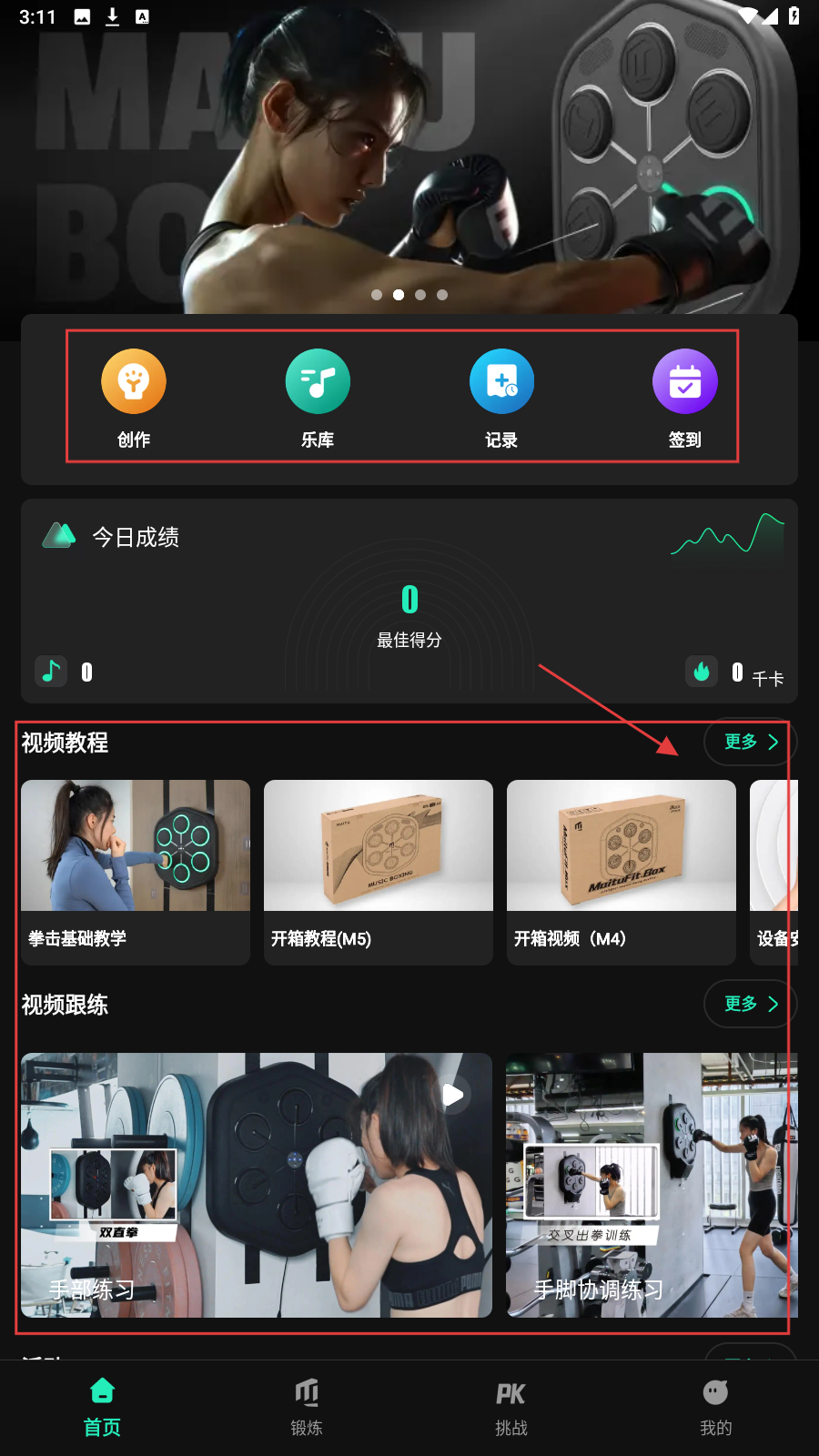 1、打开APP首页,利用【创作】【乐库】等功能,丰富拳击训练体验,先熟悉模块。