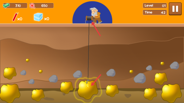3、操控矿工,瞄准金矿,释放钩子。精准抓取金矿,提升分数。注意时间限制,高效完成挖矿。
