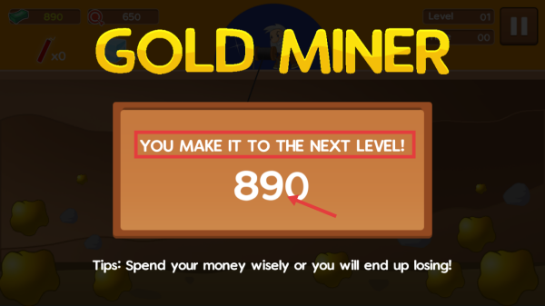 2、了解关卡目标【Your-first-goal-is-650】,明确挖矿任务。准备使用工具,开采金矿,积累分数。