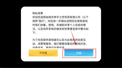 2、阅读“隐私政策”弹窗,点击“同意”继续,若点“不同意”将无法游玩。