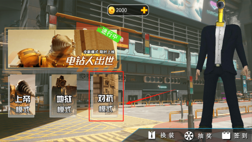 4、在大厅顶部领取2000金币奖励,随后点击“电钻人出世”限时模式,再选“对抗模式”即可开始匹配。