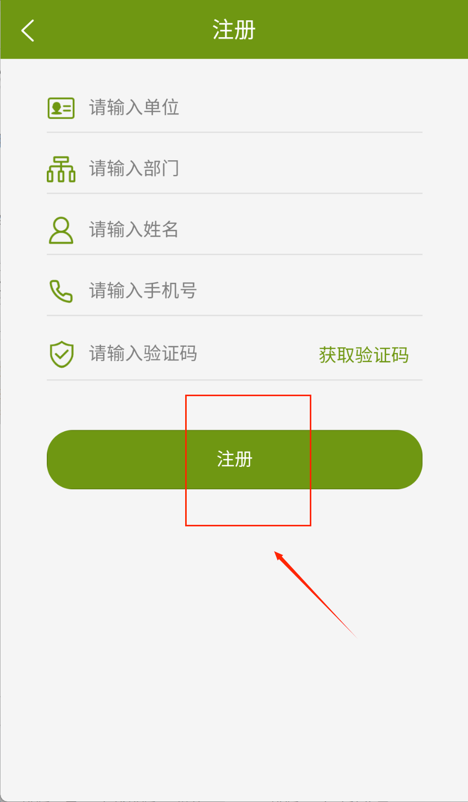 1、打开APP进入注册页面,依次填写单位、部门和姓名信息,注意核对准确性哦。