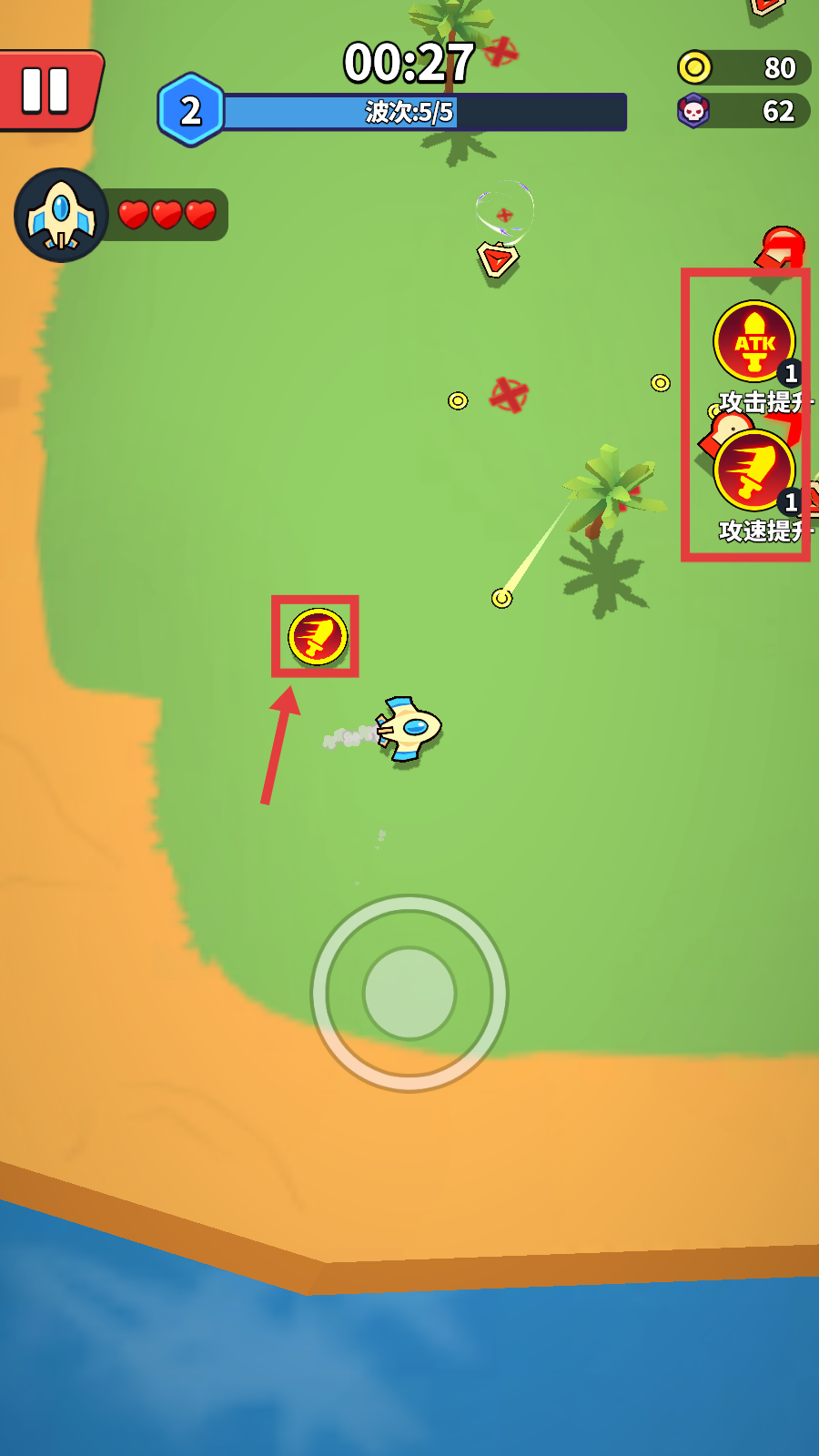 3、关卡中,优先拾取【攻击提升】和【攻速提升】道具,增强飞机作战能力,应对后续敌人。