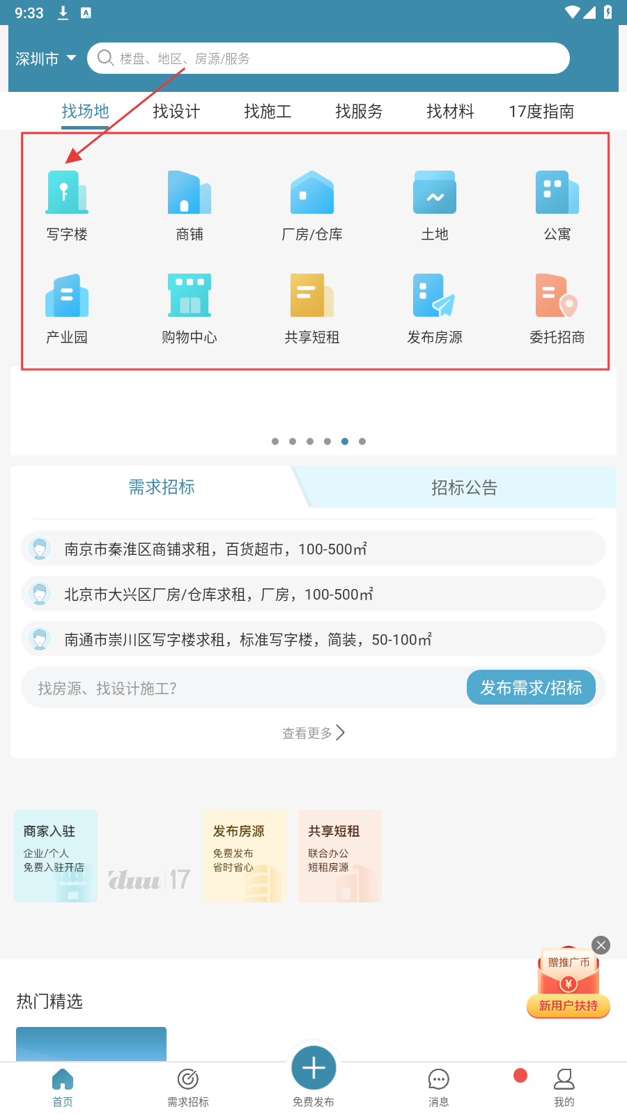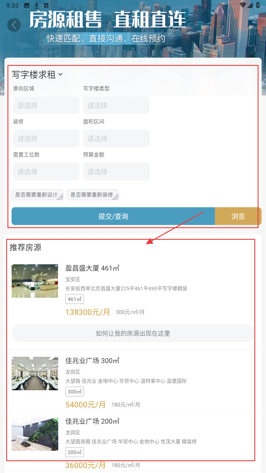 2、进入【写字楼】租售页面,可以在上方填写信息发布求租信息,也可以点击下方推荐房源。