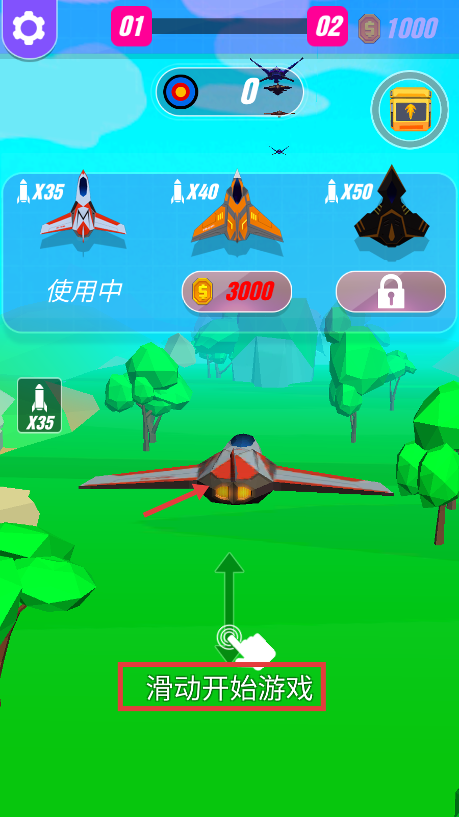 1、游戏通过滑动屏幕来启动游戏,选择合适的战机,开启飞行射击挑战。