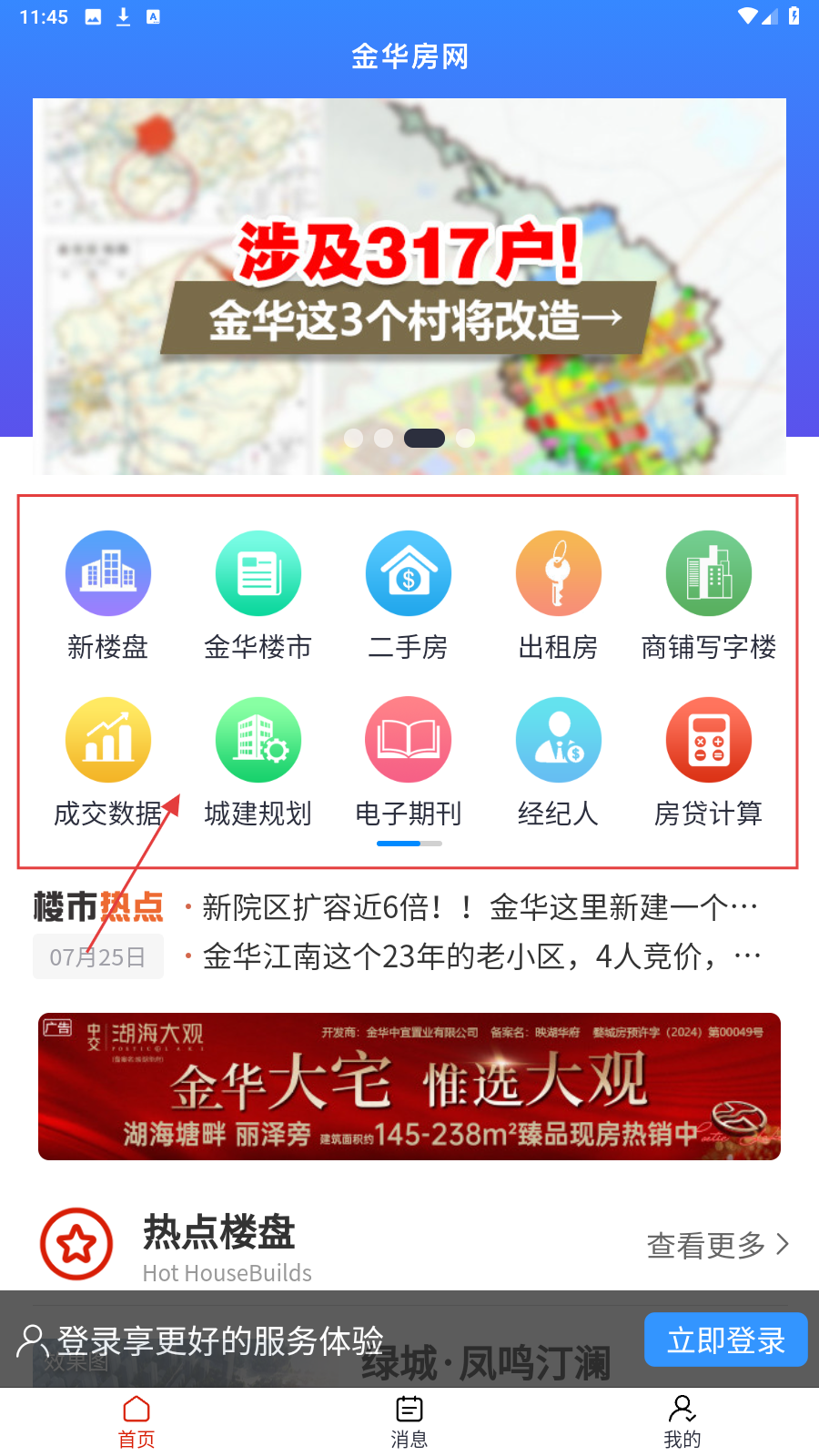1、打开应用,在【首页】有新楼盘、金华楼市、二手房等功能按钮,如点击【新楼盘】。