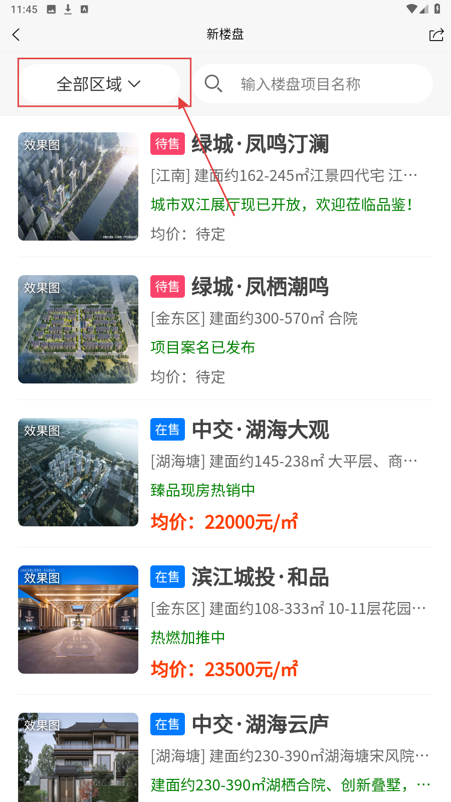 2、进入【新楼盘】页面,点击【全部区域】按钮进行筛选。