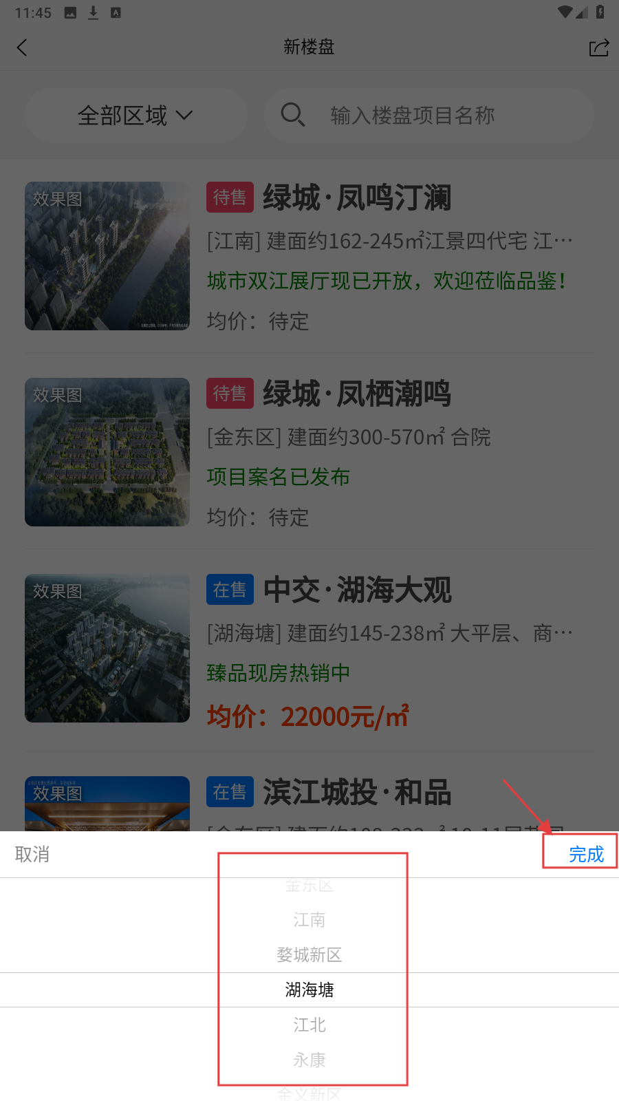 3、上下滑动选择需要购房的区域,选择好后点击【完成】。