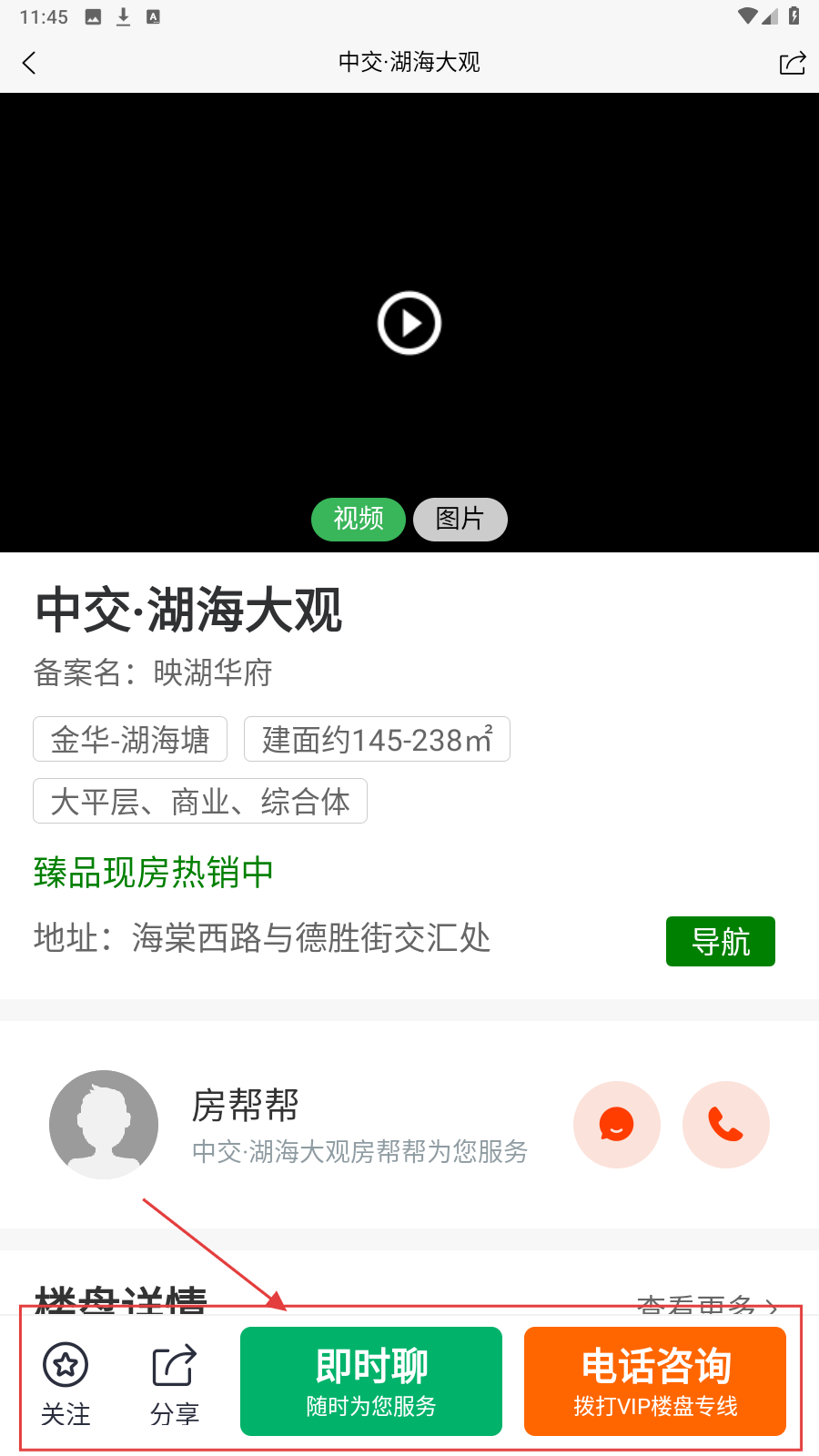 4、进入房源详情页,进行查看房源信息,如若想进一步了解点击下方【即使聊】或【电话咨询】按钮即可。